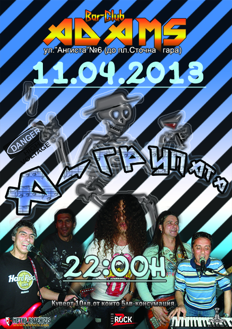 На 11 май, събота, в бар-клуб “Адамс” ще се състои концерт на А-ГРУПАТА. Началният час е 22:00 ч., кувертът е 10 лева (5 лева от които са консумация). Заведението се намира на ул. Ангиста 6 (до пл. Сточна Гара).
