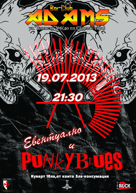 На 19 юли, петък, в бар-клуб “Адамс” ще се състои концерт на групите PUNKY BLUES и ЕВЕНТУАЛНО. Началният час е 21:30 ч., кувертът е 10 лева (5 лева от които са консумация). Заведението се намира на ул. Ангиста 6 (до пл. Сточна Гара). Вижте програмата на клуба за месец юли.
