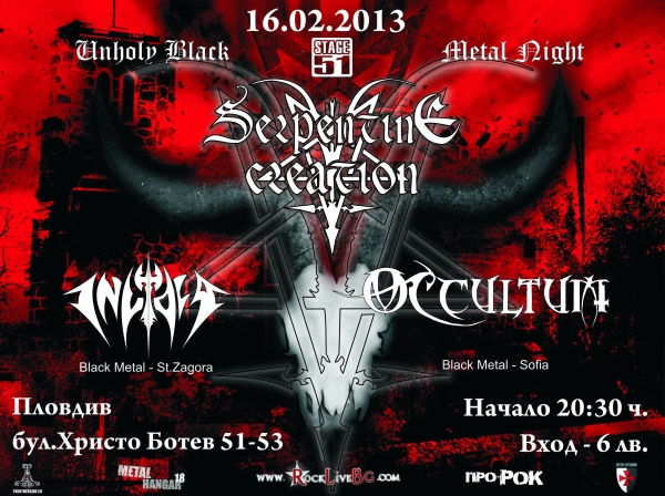 Стана ясно, че SERPENTINE CREATION ще направят концерт в пловдивския клуб „Stage 51“ (бул. Христо Ботев 51-53) на 16 февруари 2013 г. заедно с групите INVIDIA и OCCULTUM. Началото е от 20:30 ч., входът е 6 лева.
