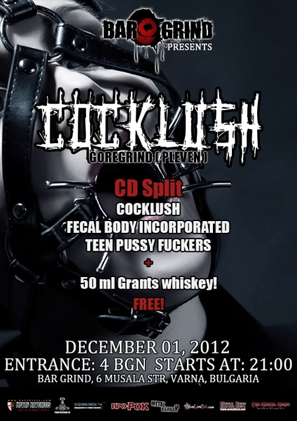 Плевенските гор-грайндъри COCKLUSH ще треснат по шевовете варненския „Bar Grind“ в събота, 1 декември. Всеки посетител на концерта ще получи тройния сплит на COCKLUSH / FECAL BODY INCORPORATED / TEEN PUSSY FUCKERS + 50 ml Grants уиски. Началото е от 21:00 ч., входът е 4 лева. “Bar Grind” се намира на адрес ул. Мусала 6, Варна.
