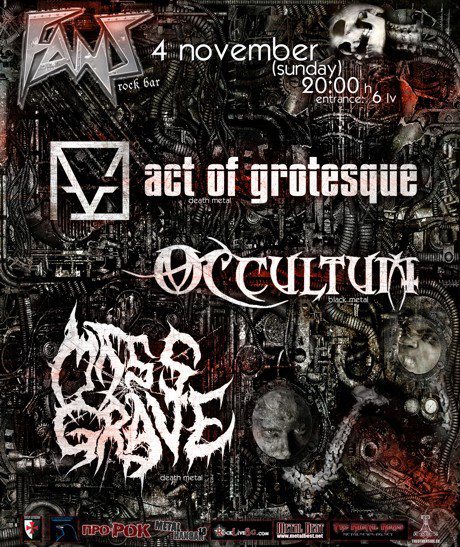 Бургаските Death Metal касапи ACT OF GROTESQUE, предвождани от кръвожадния Ангебу, ще раздават правосъдие в столичния клуб „Фенс“ на 4 ноември 2012 г. (неделя). Съучастници в престъплението ще бъдат MASS GRAVE (Death Metal) и OCCULTUM (Black Metal). Началото е от 20:00 ч., входът е 6 лв.